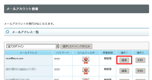 表示されたメールアカウント一覧から、設定を行なうメールアカウント右側にある「編集」ボタンをクリックします。