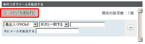 更に「ルールセットを追加する」ボタンを押す事で1メールアカウントにつき最大10個まで転送条件、転送先メールアドレスの指定が可能です。
