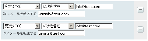 ●宛先に「info@test.com」が含まれる場合「yamada@test.com」と「tanaka@test.com」へ転送する