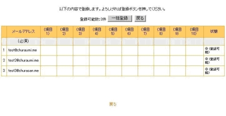 入力した情報の確認画面が表示されます。登録内容に問題がなければ一括登録ボタンを押すと入力した情報が登録され、画面は「メールアドレス一覧」 画面に移動します。
