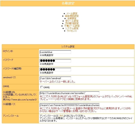 ユーザー様毎に設定が変わります。CGI設置URLはインストール時の一番最初にありました「インストールする場所」と同じものです。CGI設置パスはCGI設置URLのディスクでの設置場所となります。ファイルマネージャより参照した際の設置場所の頭に/export/usr/home/ex*********/が付加されたものとなります。この2つの設定も問題がなければ特に変更の必要はございません