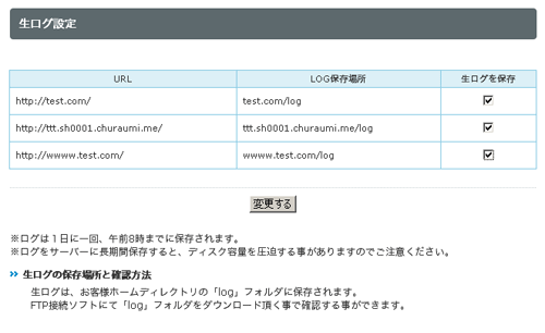 上記画面が表示されますので、アクセス解析対象URLから「生ログを保存」にチェックを入れ、「変更する」 ボタンをクリックします。