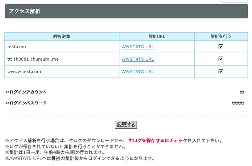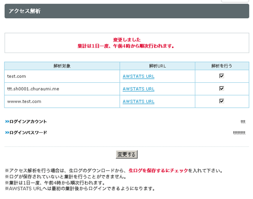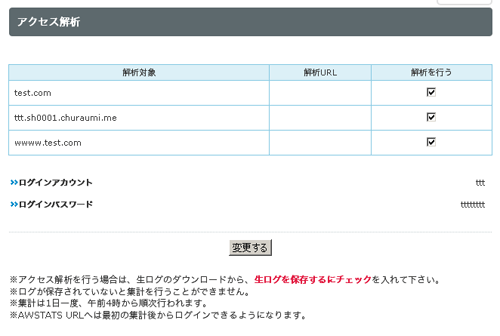 上記画面が表示されますので、解析対象ドメインの「解析を行う」にチェックを入れ、「ログインパスワード」を入力して「変更する」ボタンをクリックします。