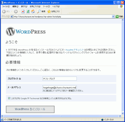 上記の入力内容を確認のうえ「WordPressをインストール」ボタンをクリックします。