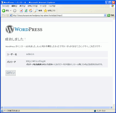 「インストールが完了しました!」のメッセージが表示されるので、アドレスをクリックします。