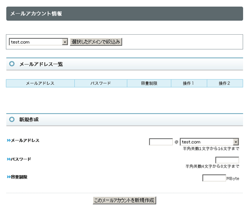 メールソフト等に設定頂くメールアカウントの情報は、「コントロールパネル」