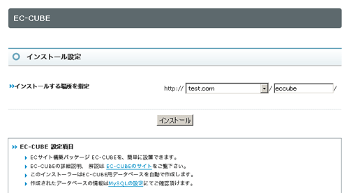 画像のようなEC-CUBEインストール画面が表示されますので、「インストール先」からインストールするドメインを選択のうえ「インストール」ボタンをクリックするとEC-CUBEのインストールが開始されます。