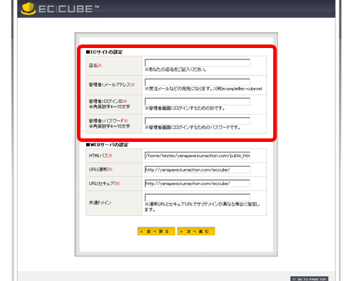 管理者アカウント情報を入力し、「次へ進む」ボタンをクリックします。
