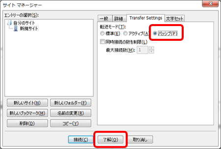 「転送設定」タブをクリックします。転送モードの「パッシブ」にチェックをつけます。 設定が完了しましたら、「了解」で設定を保存してください。