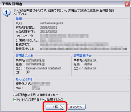 証明書を確認します。「了解」をクリックします。