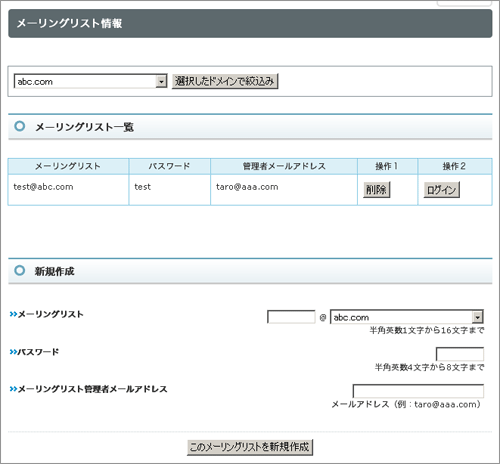 新規作成より、以下の項目を入力して「このメーリングリストを新規作成」ボタンをクリックします。