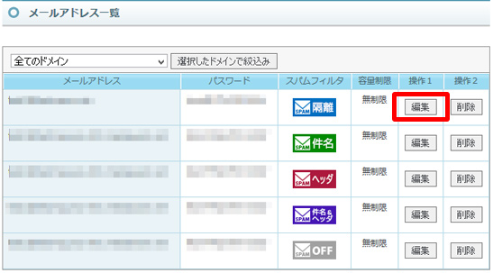 表示されたメールアカウント一覧から、設定を行なうメールアカウント右側にある「編集」ボタンをクリックします。