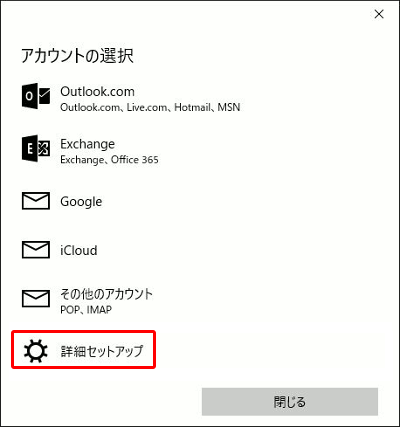 「アカウントの選択」画面から[詳細セットアップ]をクリックします。