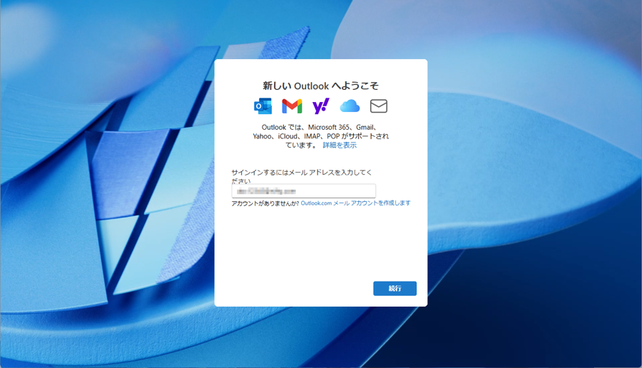「新しいOutlookへようこそ」画面が表示されたら、メールアドレスを入力し[続行]をクリックします。
