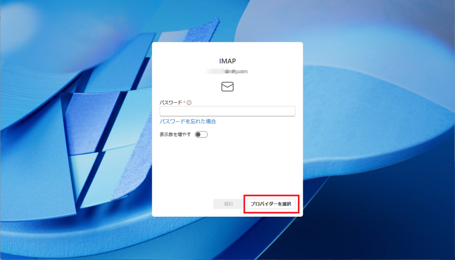 メールの設定画面が表示されます。画面上部に「IMAP」と表示されている場合、パスワードは入力せず、右下の[プロバイダーを選択]をクリックします。