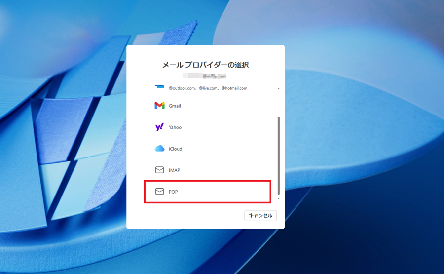 「メールプロバイダーの選択」画面が表示されたら、下にスクロールし[POP]をクリックします。