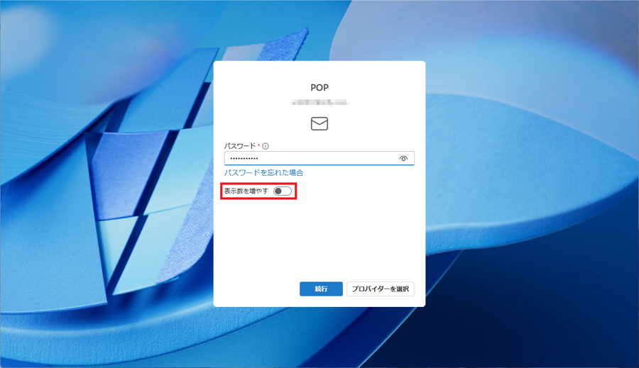 POPの設定画面が表示されます。[メールパスワード]を入力した後、[表示数を増やす]をクリックしONにします。