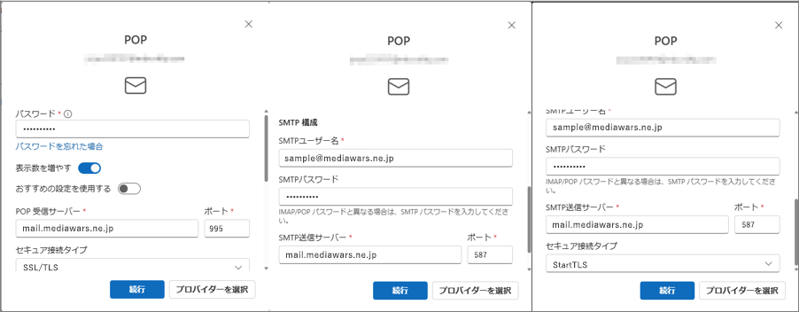 ※IMAP形式で使用されたい場合 : STEP3にて「IMAP」を選択し、IMAP受信サーバーのポート番号を「993」に設定します(その他の設定値は同じ)。