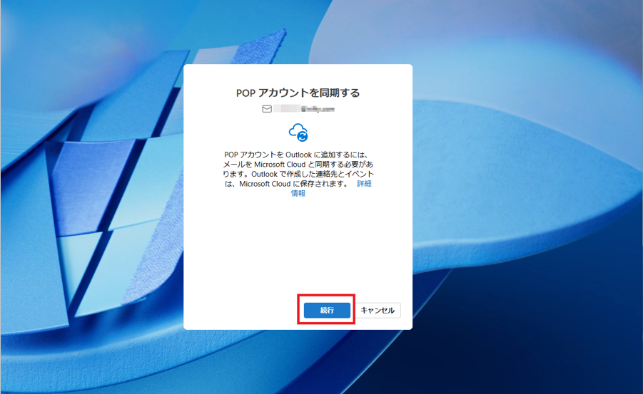 「POPアカウントを同期する」画面が表示されます。内容を確認し[続行]をクリックします。